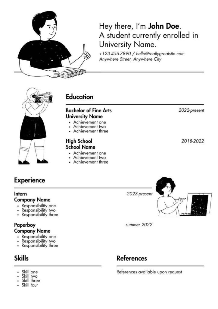 Comienza tu trayectoria profesional con nuestra elegante plantilla de currículum minimalista ilustrada en blanco y negro, hecha a medida para estudiantes listos para sumergirse en el mundo profesional. Perfecta para pasantías, trabajos a tiempo parcial o tu primer puesto importante, esta plantilla hace que crear tu currículum sea muy sencillo, asegurando que destaques entre la multitud. Dígale adiós a lo soso y hola a lo impresionante con un diseño que dice mucho sobre su potencial, al mismo tiempo que mantiene las cosas sencillas y elegantes. ¡Toma esta plantilla y comienza a allanar tu camino hacia el éxito hoy!
