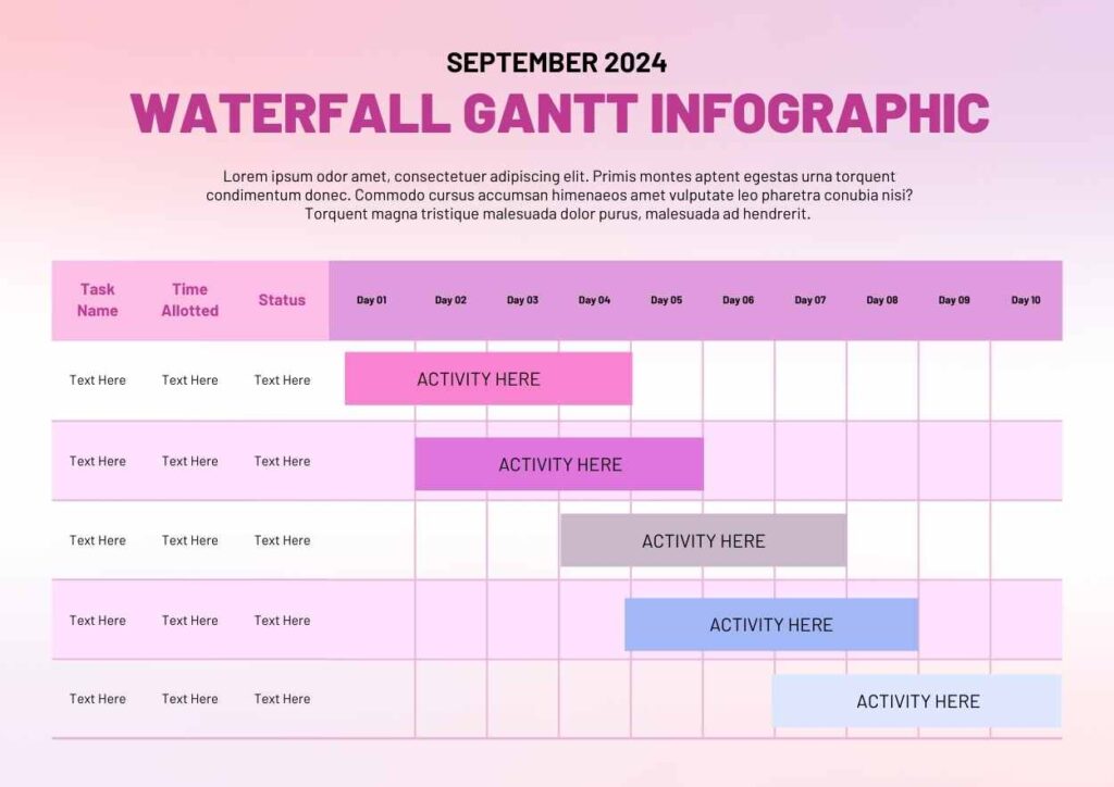 Si deseas más plantillas parecidas a Infografía de la cascada Gantt, puedes visitar nuestro listado completo de Slides de la categoría Infografías.